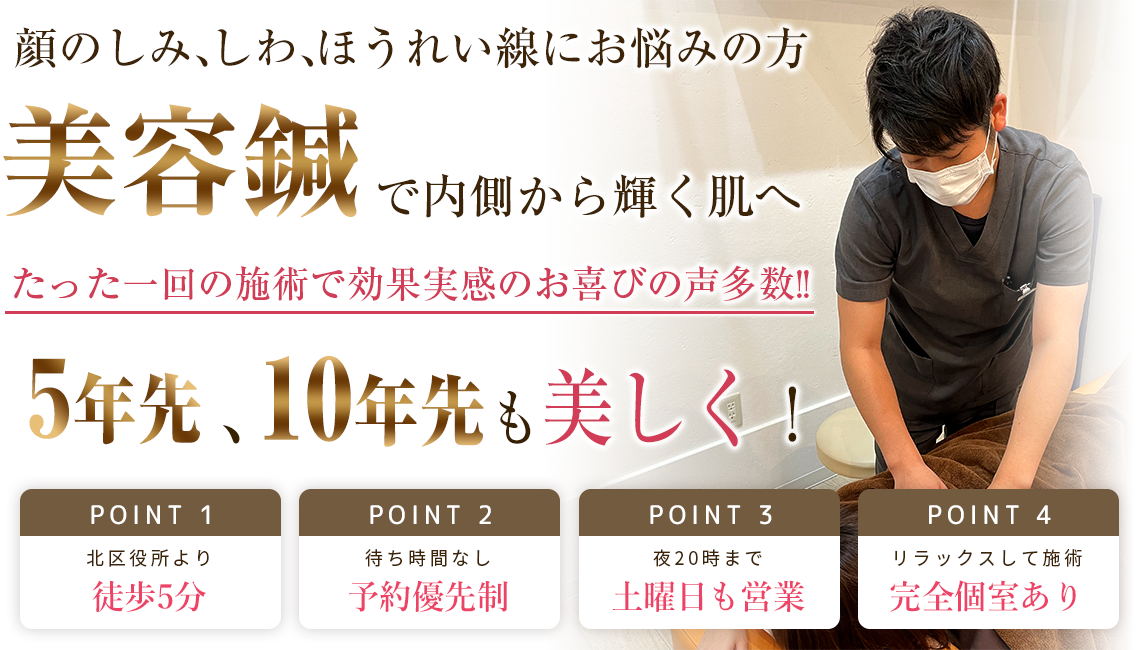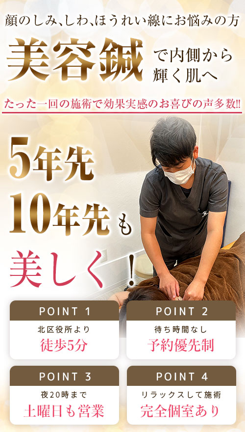 さらに鍼の元々の効果である、深部毛細血管の循環をよくすることにより、細胞内に溜まっている老廃物や余分な水分を排出し各細胞に栄養と酸素を送り込むことにより、むくみやくすみ、そして様々な肌のトラブルにアプローチし新陳代謝を高めていきます。
